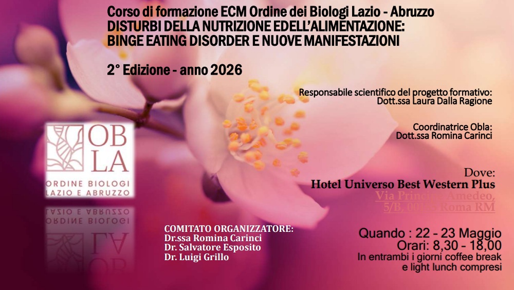 Torna a Roma il corso di formazione ECM promosso dall’Ordine dei Biologi del Lazio e dell’Abruzzo, dedicato ai disturbi della nutrizione e dell’alimentazione. L’appuntamento, dal titolo “Disturbi della nutrizione e dell’alimentazione: binge eating disorder e nuove manifestazioni”, si terrà il 22 e 23 maggio (dalle 8.30 alle 18.00) nei locali dell’Hotel Universo Best Western Plus, in via Principe Amedeo 5/B.