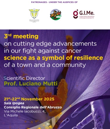 Il 21 e il 22 novembre 2025, nella “Sala Ipogea” del Consiglio regionale dell’Abruzzo (in via Michele Iacobucci, 4), a L’Aquila, si terrà la terza edizione del meeting “On cutting edge advancements in our fight against cancer science as a symbol of resilience of a town and a community“. L’evento, di cui direttore scientifico è stato designato il prof. Luciano Mutti, è accreditato ECM (11 i crediti riconosciuti) ed è stato organizzato dall’ateneo aquilano. L’iscrizione è gratuita.
